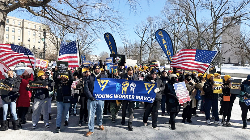 Yes, labor is beginning to move. On February 7th, AFGE, supported by CBTU, the AFL-CIO, USSA and others called a Young Workers March in DC, demanding a living wage, healthcare and childcare, affordable housing and education without debt.