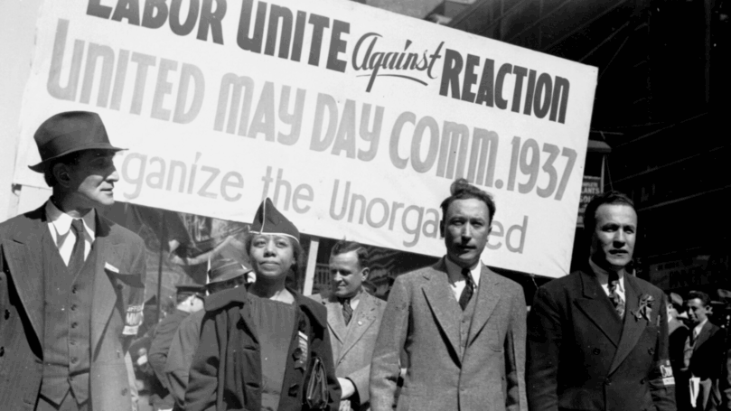 Images: May Day March and Rally by New York State Nurses Association. Public domain; Edith Ransom and Charles Zimmerman (center) of ILGWU Local 22 march with others in the 1937 May Day parade. International Ladies Garment Workers Union Photographs (1885-1985). Kheel Center/Flickr; We fight for workers by AFL-CIO; May Day! Celebrating the Power of Solidarity. NEA.