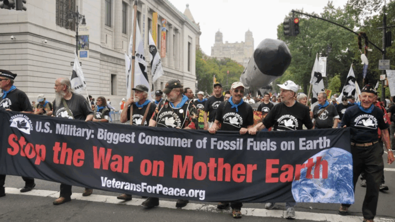 Images: NYers Against ICE protest. Creative Commons. Veteran for Peace members march in New York. Veterans for Peace.