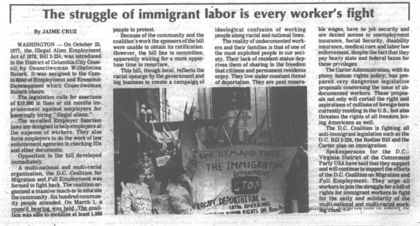 Images: 1. Jaime Cruz, Jr., at the recording of this oral history, just over a month before his passing. (Bennett S. / People’s World) 2. Jaime Cruz, Jr. with Arturo Griffiths. Behind them, from left to right, are Carl Gentile and Mark Gruenberg. (People’s World) 3. ‘The Struggle of Immigrant Labor is Every Worker’s Fight,” an article by Jaime Cruz published April 8, 1978 in the Daily World, predecessor to People’s World. (People’s World Archives) 4. Jaime Cruz, Jr., hugs Francisco Campbell, Nicaraguan Ambassador to the United States, at an event marking the anniversary of the founding of the Claudia Jones School for Political Education. (People’s World)
